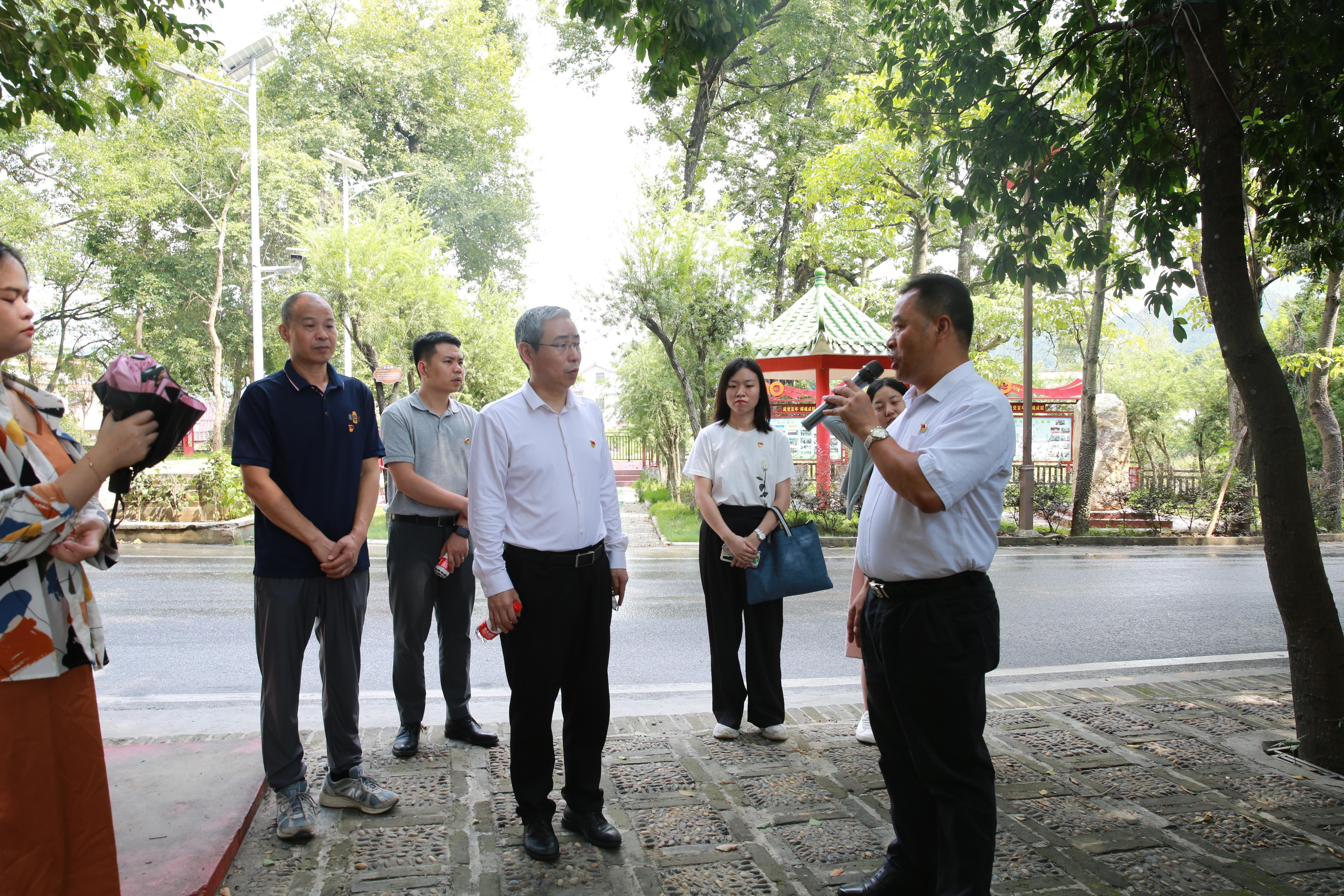 广东省委党校二级调研员、驻镇帮镇扶村职责队队长苏益松(右一)在百年党史路开最先容乳源一六镇乐夫村