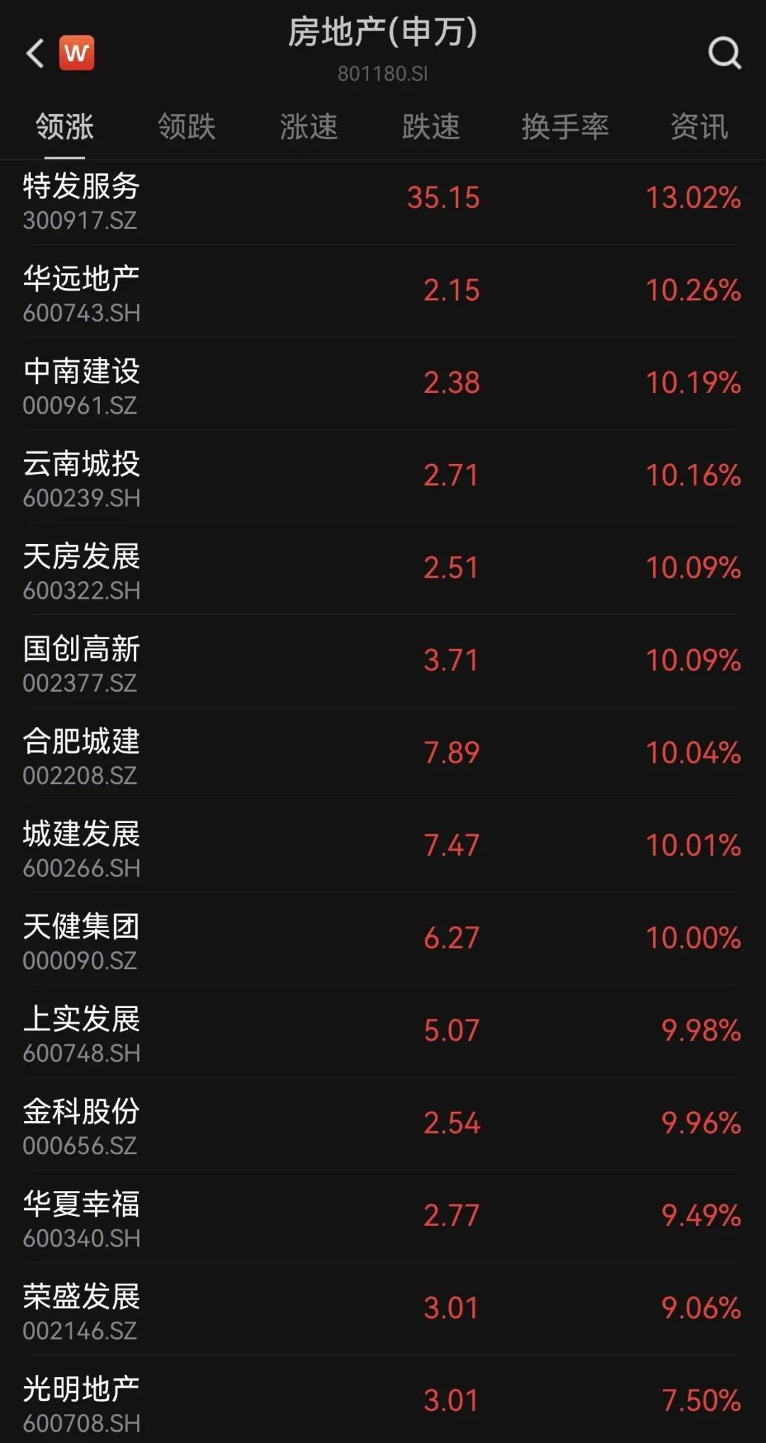 房地产板块爆发,申万一级房地产行业指数涨近3%,板块内特发工作大涨超13%,华远地产、中南树立、天房发展、国创高新、合肥城建等多只股票涨停。