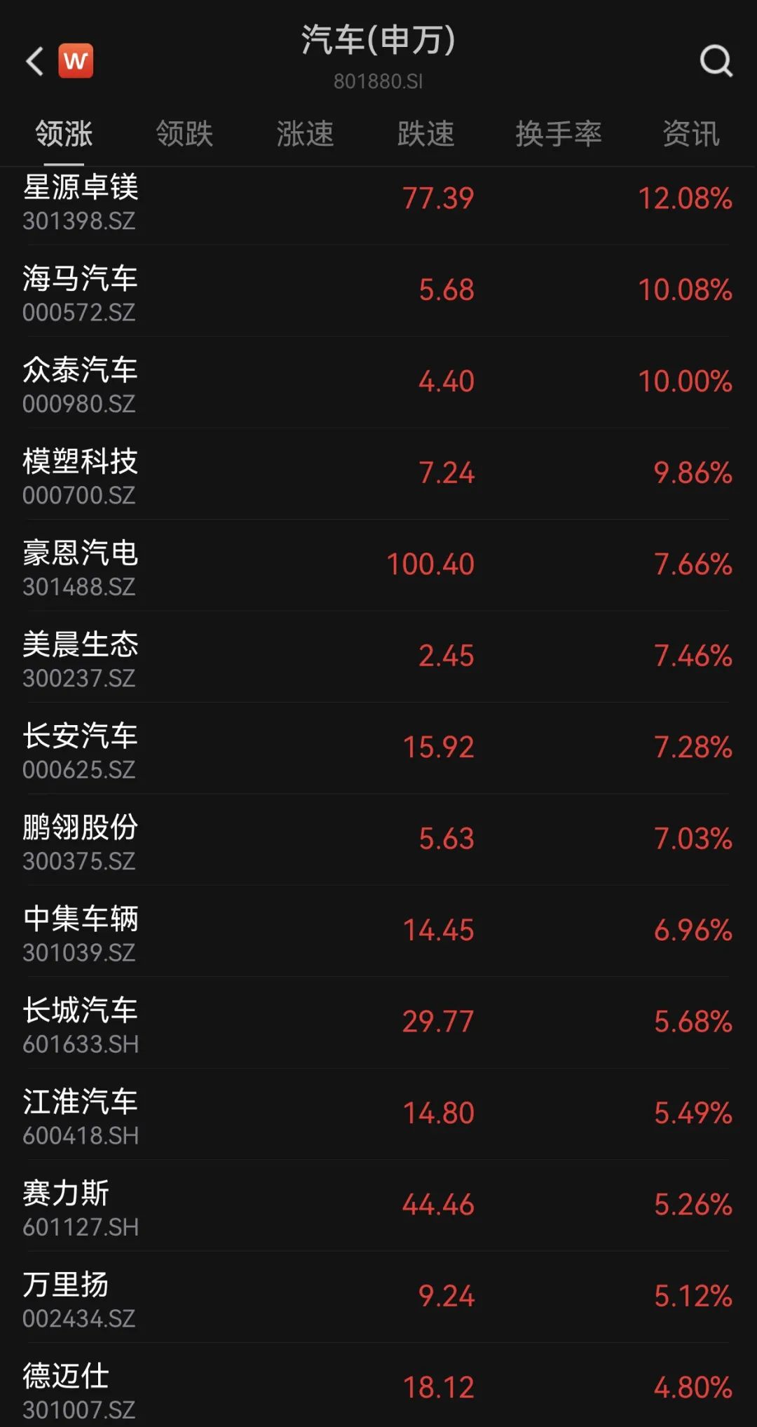 今天上昼,大破钞推崇活跃。汽车板块中,星源卓镁涨超12%,海马汽车、众泰汽车涨停,模塑科技(维权)涨逾9%。港股市场中恒大汽车一度大涨近60%。
