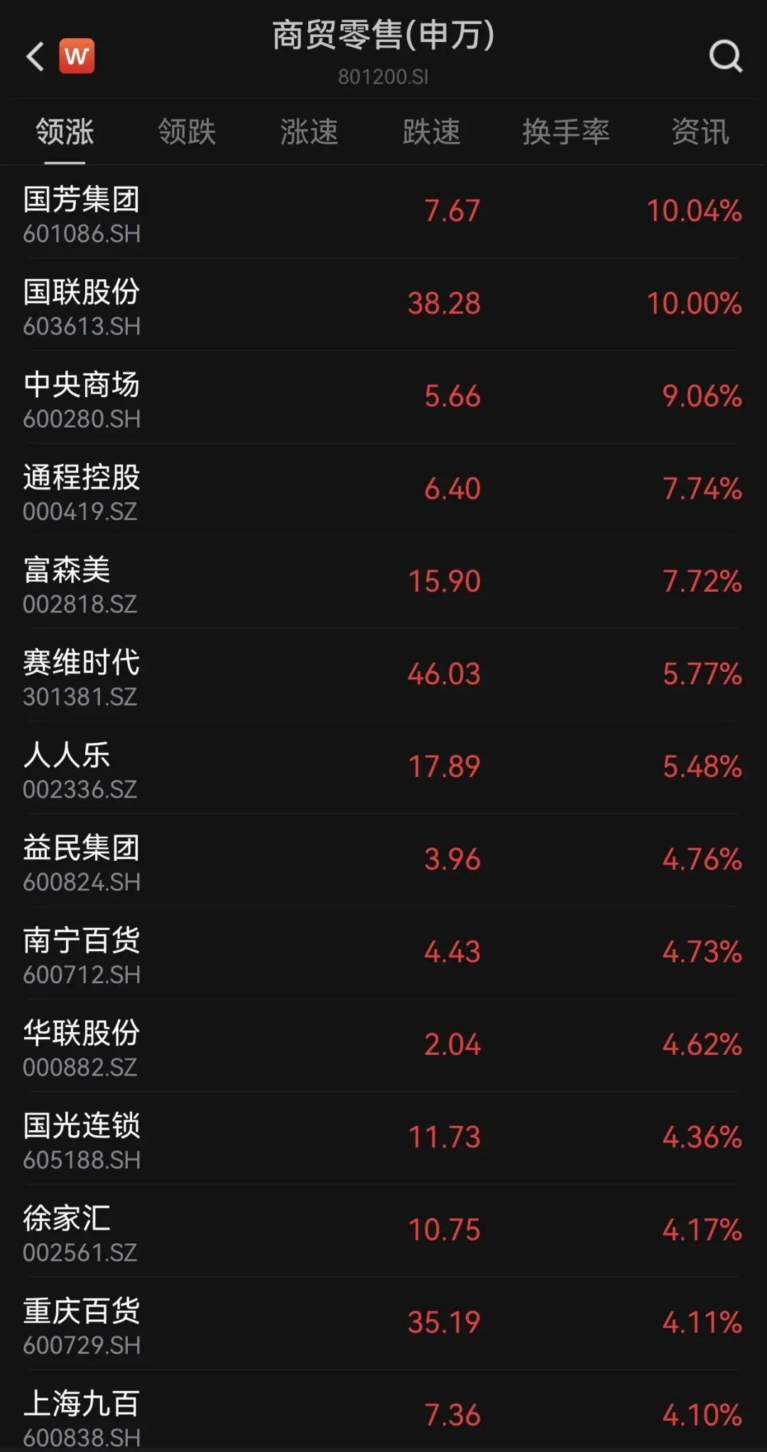 商贸零卖板块中,国芳集团、国联股份涨停,中央市集涨逾9%,通程控股、富森好意思涨逾7%。