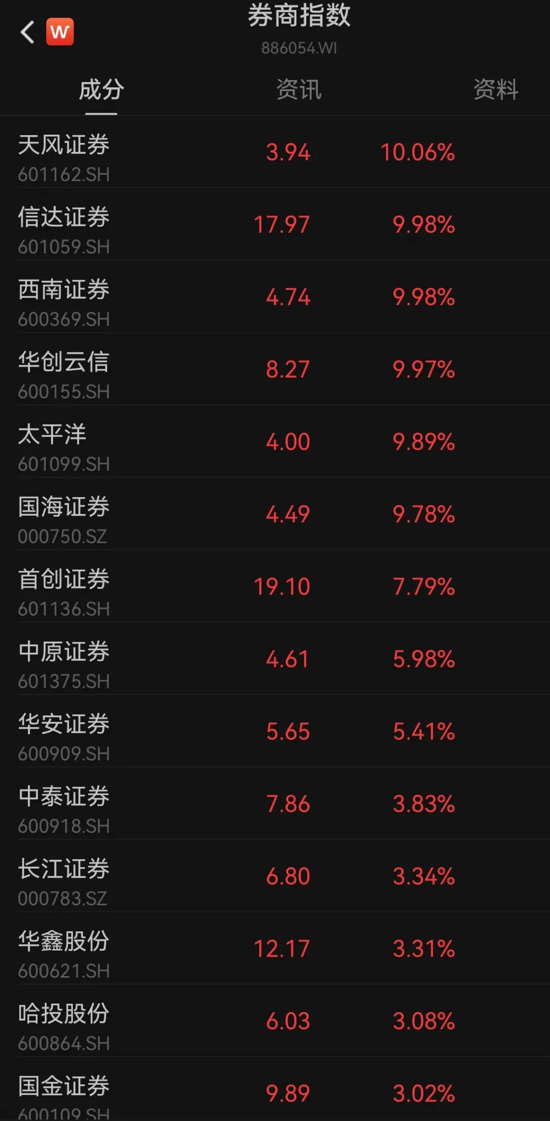 素有“牛市旗头”之称的券商板块本日早盘出现冲高回落走势。步调午间收盘,天风证券、西南证券、信达证券、华创云信、太平洋涨停,其中太平洋五天四板,号称这一轮券商行情的龙头股。